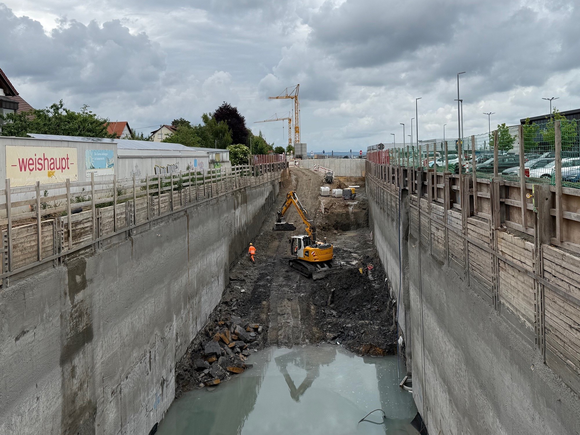 Dabei wurden bei sehr wechselhaftem Wetter die Baustelle des künftigen unterirdischen Fern- und Regionalbahnhofs am Stuttgarter Flughafen im Rahmen des Projekts Stuttgart 21 sowie